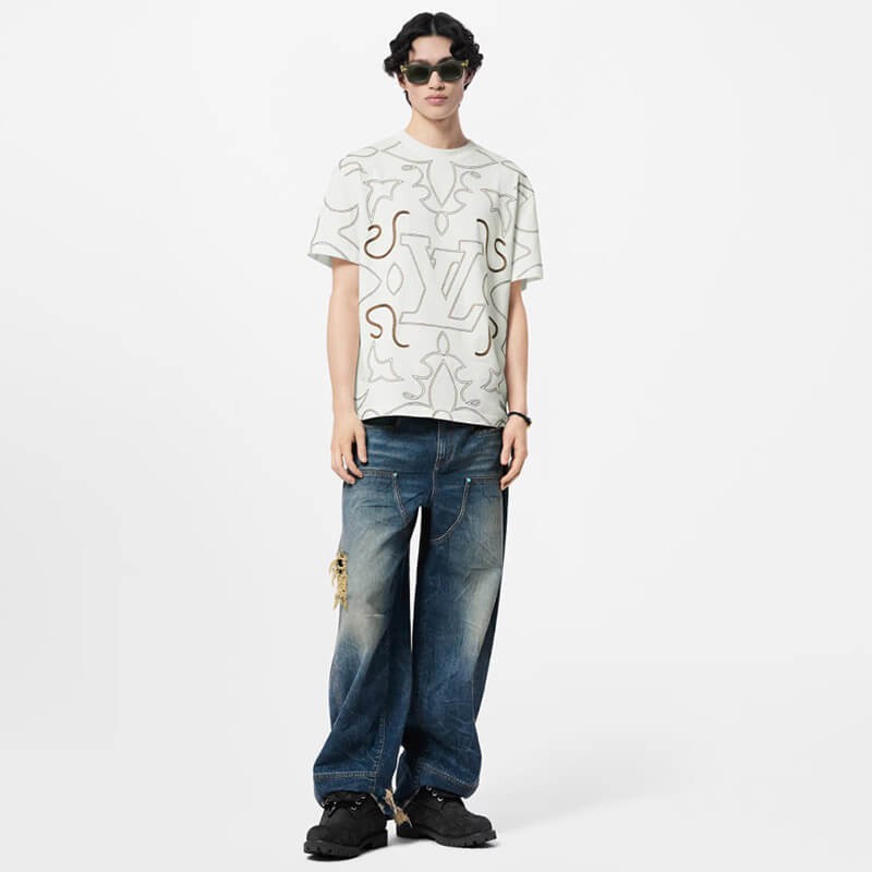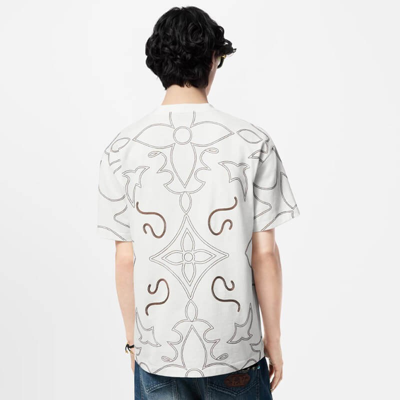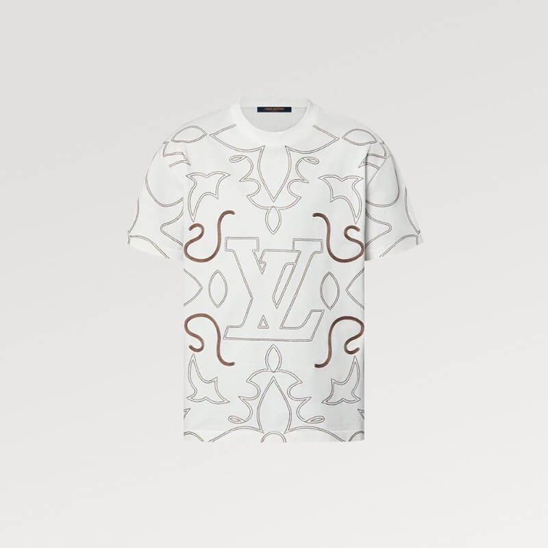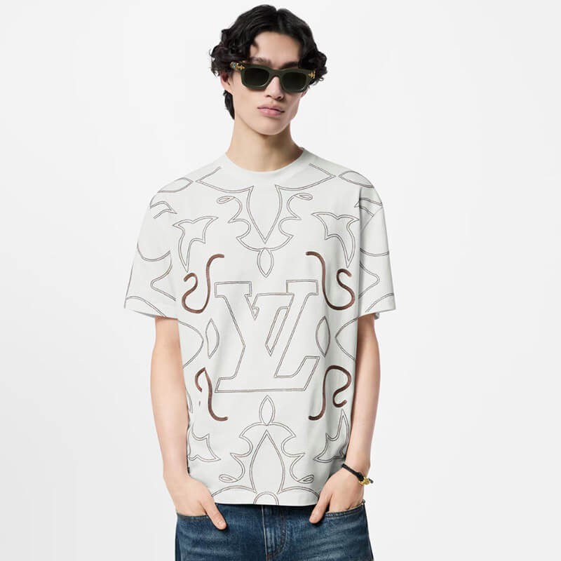 このグラフィック T シャツは、2024 年秋冬ショーの LV アラベスク シグネチャーを強調しており、柔らかな白いコットン ジャージにコントラストのある糸で刺繍されています。カウボーイ ブーツのステッチからインスピレーションを得た華やかなパターンには、胸元にモノグラムの花と LV イニシャルが組み込まれています。このモデルは、ロマンチックでモダンなノートでカジュアルな服装を引き立てます。