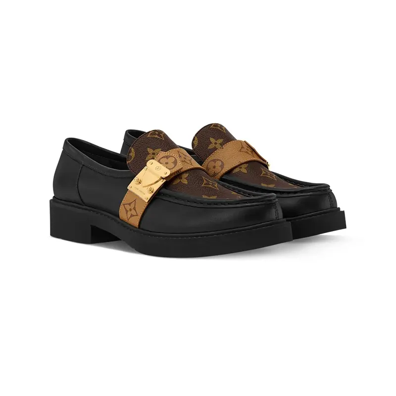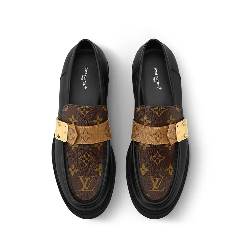 スムースレザーにモノグラム・キャンバスのヴァンプを添えて再解釈した、今シーズンの「アカデミー ローファー」。アッパーにかかるストラップにはコントラストを効かせたモノグラム・リバース キャンバスを使用し、ルイ・ヴィトンのトランクを象徴するSロックスタイルの留め具から着想を得たゴールドカラーのアクセサリーをあしらいました。軽量なマイクロアウトソールがトレンド感溢れるボーイッシュなスタイルを完成させます。